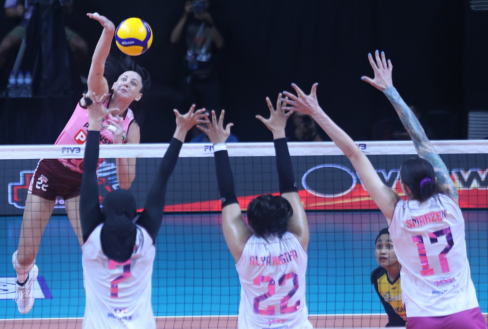 Upaya keras Yonkaira Pena dan Malwina Smarzek untuk mengejar ketertinggalan selalu kandas oleh pertahanan kokoh yang digalang Yulis Indah dkk. Phonska Plus menjauh 19-14 sebelum akhirnya menutup laga dengan skor 25-20.