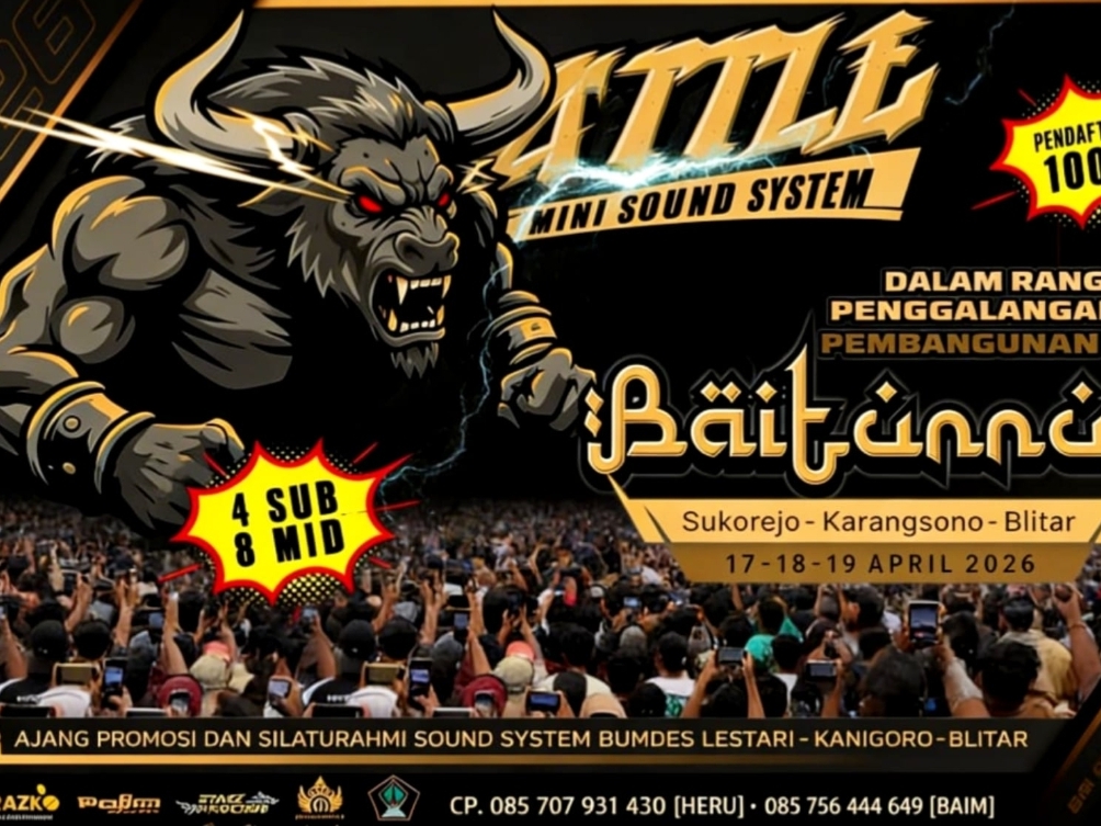 Blitar, WartaTransparansi.com – Suasana meriah dipastikan akan menyelimuti Desa Karangsono, Kecamatan Kanigoro, Kabupaten Blitar. Selama tiga hari penuh, mulai 17 hingga 19 April 2026, ajang Battle Mini Sound System siap digelar di BUMDes Kresi, menghadirkan dentuman audio berkualitas sekaligus semangat kebersamaan.