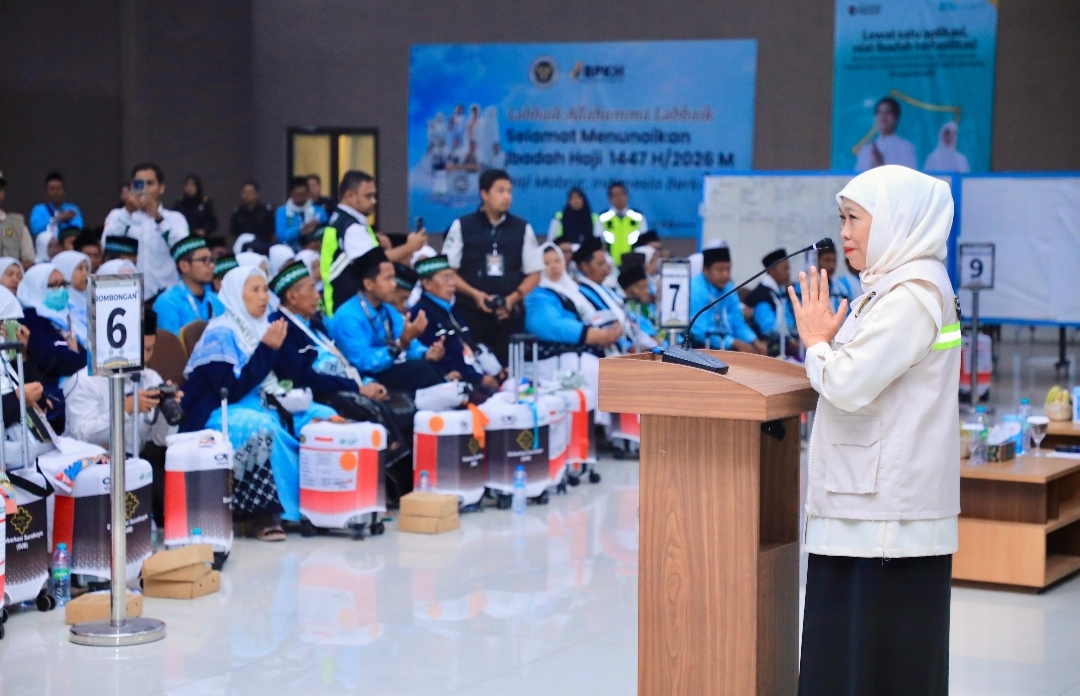 SURABAYA, Wartatranspsransi.com – Gubernur Jawa Timur Khofifah Indar Parawansa secara resmi melepas keberangkatan jemaah haji kelompok terbang (kloter) pertama Embarkasi Surabaya tahun 1447 H/2026 M di Asrama Haji Surabaya, Rabu (22/4). Dalam pelepasan tersebut, Khofifah berpesan agar para jemaah menjaga kesehatan dan kekhusyukan ibadah, terutama menghadapi tantangan cuaca ekstrem di Tanah Suci.