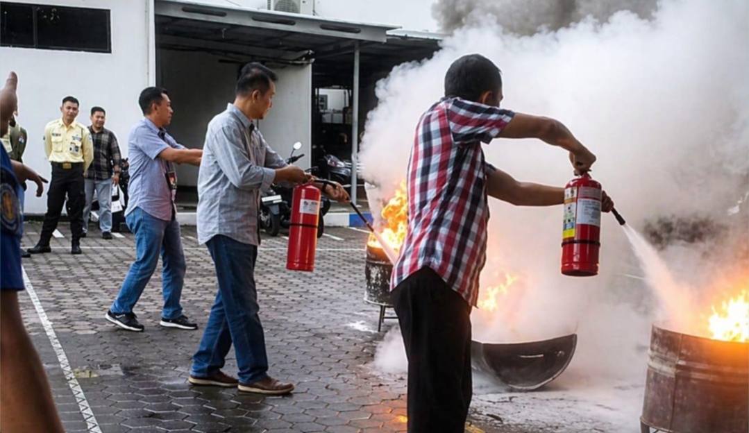 Pada pelaksanaan simulasi, peserta mempraktikkan langsung penggunaan Alat Pemadam Api Ringan (APAR) dengan skenario kebakaran ringan di area kantor. Latihan ini bertujuan agar pekerja mampu melakukan penanganan awal sebelum api membesar.